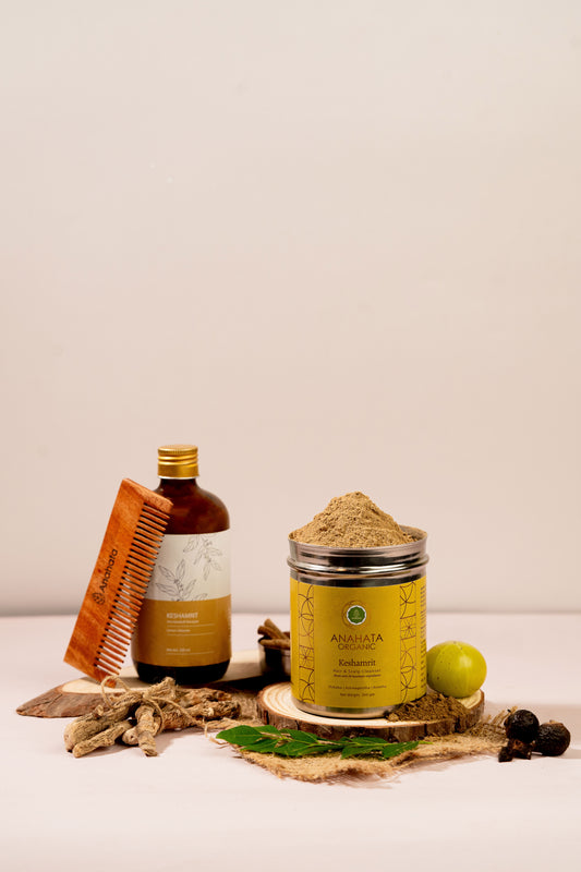 An ancient Himalayan recipe made with Indic hair growth herbs, Mystic Hair Oil is our bestseller. A botanical blend of neem, amla, hibiscus & marjoram, it helps reduce hairfall & balding, stimulates dormant hair follicles & and is guaranteed to make the hair thick, long and lustrous.